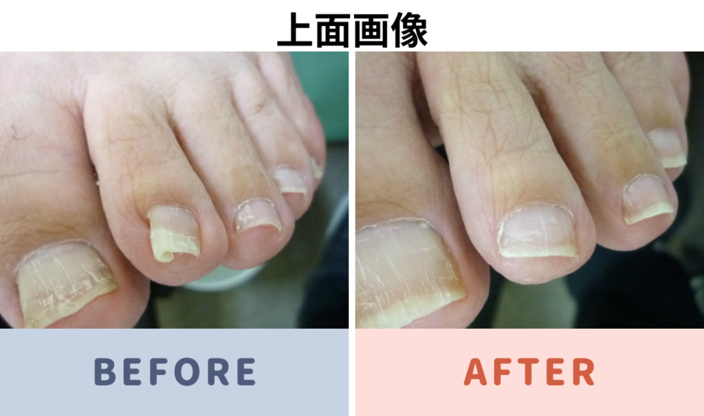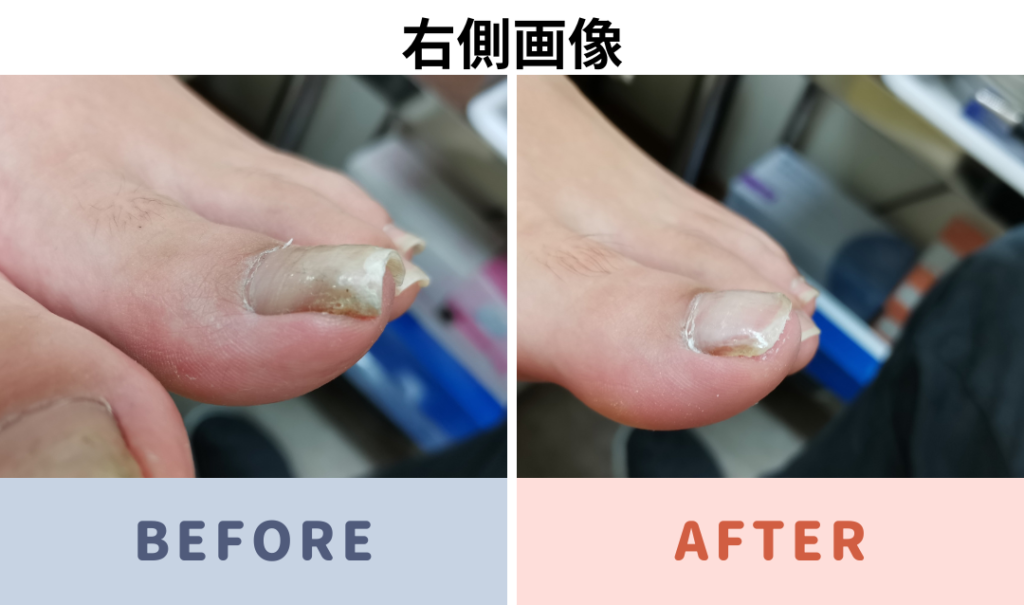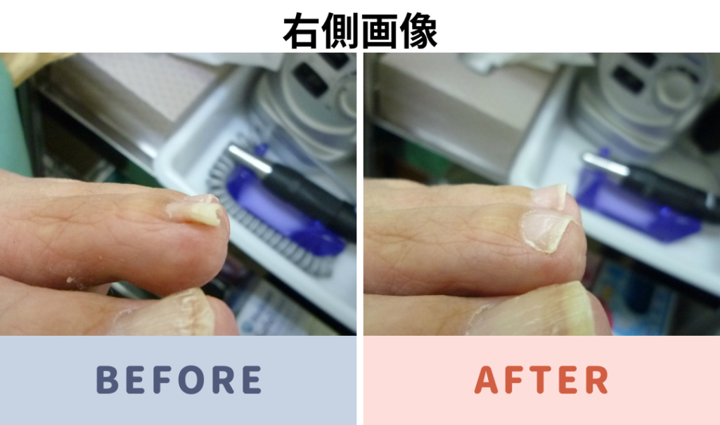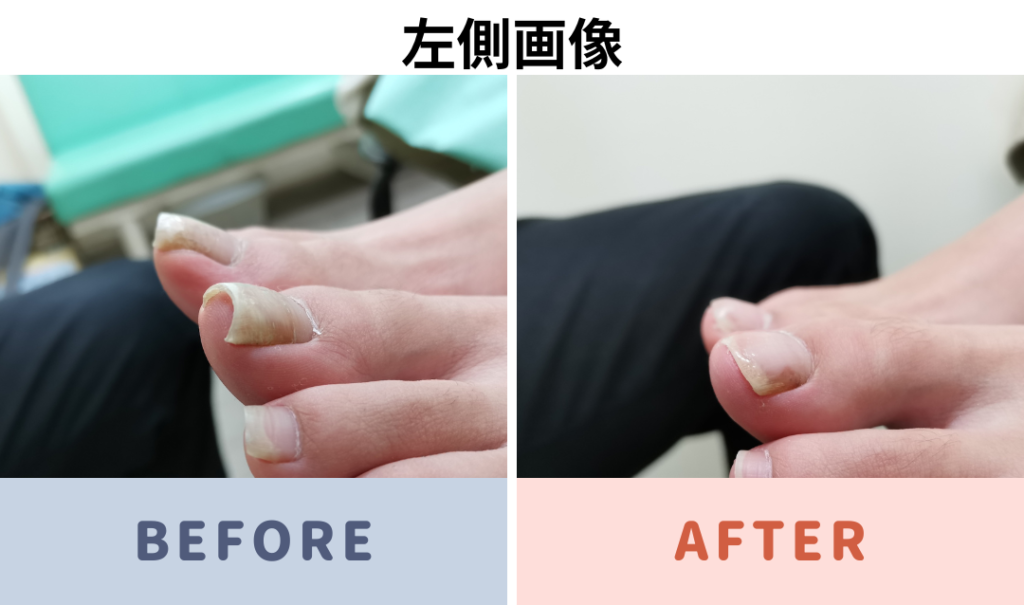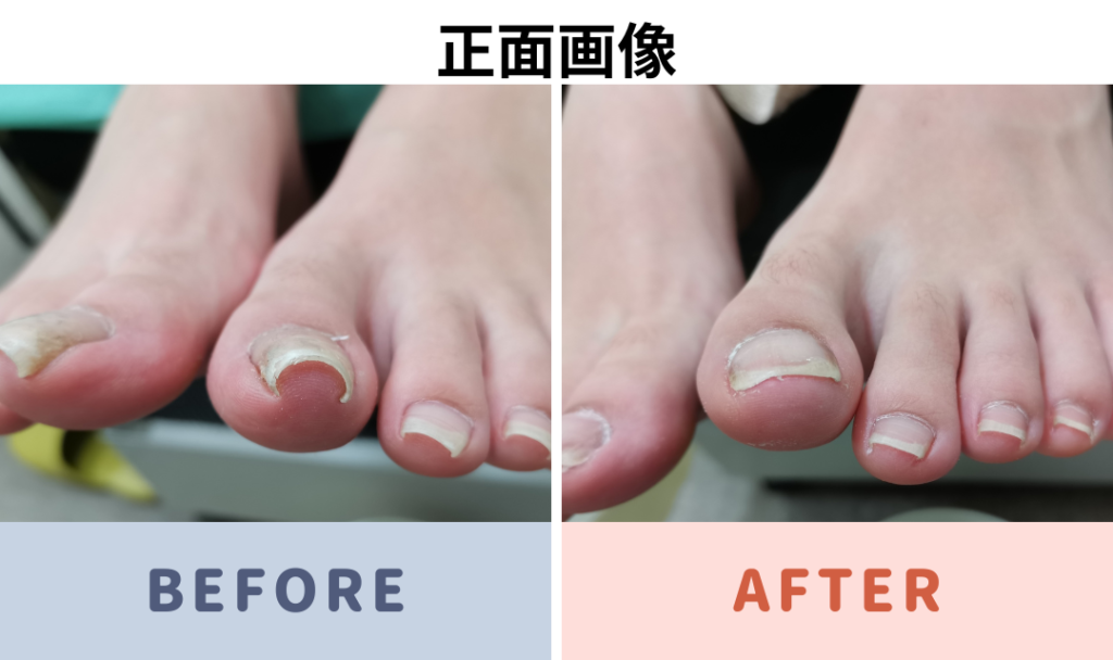 足の親指の中等度の巻き爪 補正前と補正後の写真です