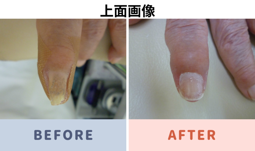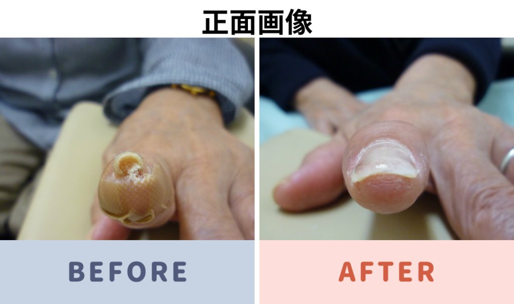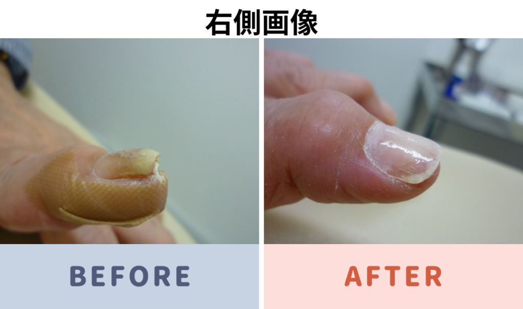 手の人差し指の巻き爪 補正前と補正後の写真です