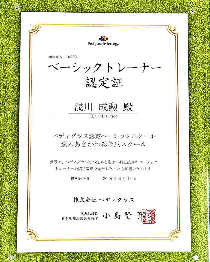 巻き爪の痛みで困っている方から感動、感謝されることの喜びを分かち合えることが出来ればと「茨木あさかわ巻き爪スクール」を開校し「ペディグラス・テクノロジー」の技術をお教えしています。